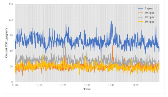 A PVC friction plate was used in this experiment to determine the filter’s fine particulates removal performance at each rotational speed. An A1 ultrafine test dust (A1 dust; Powder Technology Inc., Arden Hills MN, USA) was fed into a duct through a solid aerosol generator (SAG 410; TOPAS GmbH, Dresden, Germany), and PM concentrations were measured with a portable aerosol spectrometer (model 1.109; Grimm, Germany). During the experiment, the PM concentrations flowing into the brush filter were consistent (300 μg/m3 on average). Fine particulates removal was measured by checking the PM concentrations coming out of the brush module through the filter as the module rotated. This experiment measured the difference between the input and output PM concentration over time, for 60 min, according to the changing rotation speeds (0, 30, 45, and 60 rpm). The experiment was operated for 1 h.