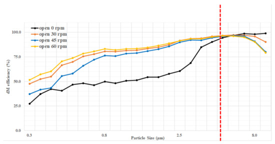 The filter efficiency was 74.0% at 0 rpm, which demonstrates the efficiency of the filter structure. The efficiency changed according to rotation speed, from 90.3 ± 1.9% at 30 rpm to 87.1 ± 2.1% at 45 rpm and, finally, back to 90.3 ± 2.0% at 60 rpm. These results suggest that electrostatic force is able to reduce PM and improve filter performance, regardless of rotation speed.
