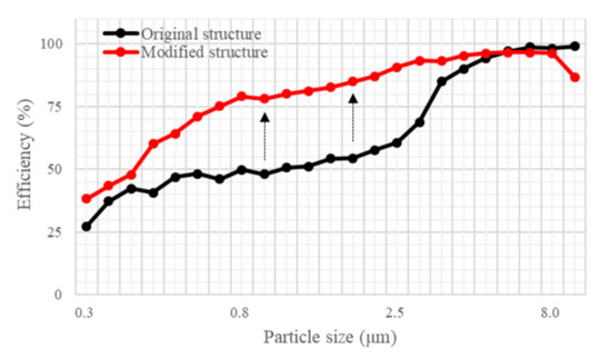 Particle size removal efficiency of the original and modified structure of the brush filter.