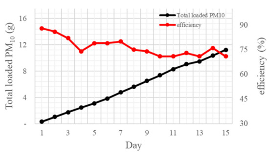 Over the course of the experiment, brush filter removal efficiency decreased from 88% to 71%. With a brush filter efficiency of 80%, the replacement cycle is 7 days. Thus, use for 70 days is possible based on the average daily atmospheric PM concentration.