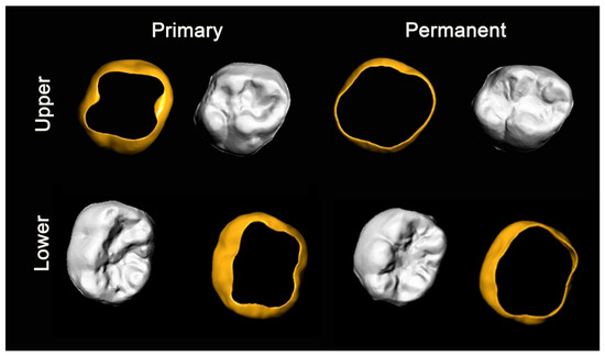 - Kondo, S.; Wakatsuki, E.; Shun-Te, H.; Sheng-Yen, C.; Shibazaki, Y.; Arai, M. Comparison of the Crown Dimensions between the Maxillary Second Deciduous Molar and the First Permanent Molar. Okajimas Folia Anat. Jpn. 1996, 73, 179–184. [Google Scholar] [CrossRef][Green Version]