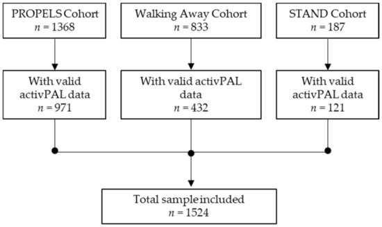 A total of 2388 participants were recruited across the PROPELS, WA, and STAND studies, of which 1524 participants had valid activPAL data and were included in these analyses (sample loss of 36%) (see Figure 1). The mean age was 59.8 years (standard deviation 11.9), 51.7% were male, 72.9% were White European, and the mean BMI was 30.3 kg/m2 (5.72). Basic participant characteristics are included in Table 1. Participants not included in these analyses (N = 864) were younger (58 years of age vs. 60 years of age, p = 0.023) and had a higher HbA1c (5.81% vs. 5.76%, p = 0.008).