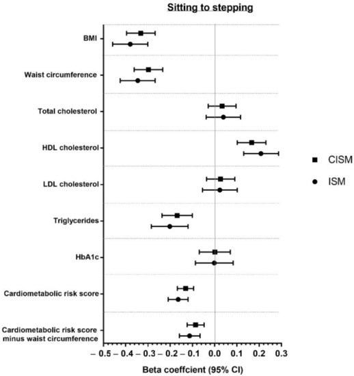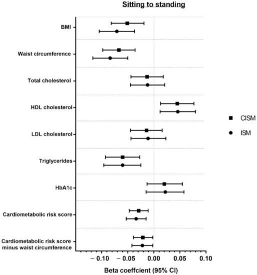 This study’s aim was to use both ISM and CISM to examine and compare associations of reallocating time from sitting to standing or stepping, assessed using thigh-worn accelerometery, with markers of cardiometabolic health.