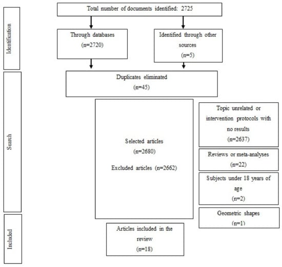 In total, 2725 studies were identified. After eliminating duplicates (n = 45), titles and abstracts were read, and a further 2662 articles were eliminated based on the exclusion criteria. Ultimately, 18 articles were included in this review (Figure 1).