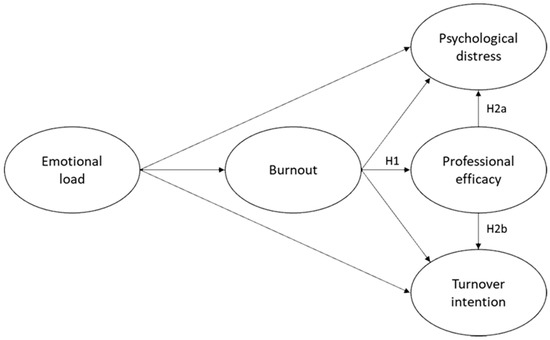 The physical mechanism by which burnout affects an individual is posited to be that burnout disturbs the functioning of the hypothalamic-pituitary-adrenal (HPA) axis, which, in turn, then affects other bodily regulatory systems specific to energy balance and mood states [20,21,22]. Specifically, the current study focuses on the health impairment process of the JD–R model that explains how job demands (e.g., emotional load) lead to an increased burnout risk that, in turn, can negatively impact outcomes for the individual (e.g., professional efficacy and psychological distress) and the organization (e.g., turnover)—see Figure 1 below for the research model. Professional efficacy will therefore be considered a consequence of BAT-assessed burnout, but professional efficacy’s utility (incremental validity) in explaining additional variance in other outcomes, that is psychological distress and turnover attention, is also assessed. In line with a previous study, psychological distress (psychological ill-health symptoms) is used as an individual health outcome referring to general psychological unwell-being and distress [19].