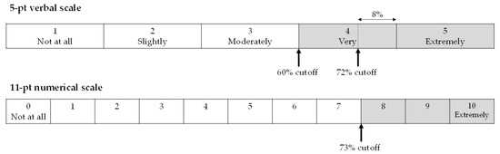 Fields et al. [3] measured the intensities of 21 modifiers in English by line marking on a 0–100 scale. Since the average intensity of “Highly” is 79 [3] (p. 661), two categories of the 7-point scale (cutoff value: 71) and three categories of the 11-point scale (cutoff value: 73) corresponding to high annoyance are reasonable considering the range of values indicating %Highly Annoyed. If only the highest category of the 7-point scale (cutoff value, 86) is used to designate a high annoyance, this would result in an extreme response. On the other hand, if the top three categories of the 7-point scale (cutoff value, 57) are included, the response would be classified as median annoyance.