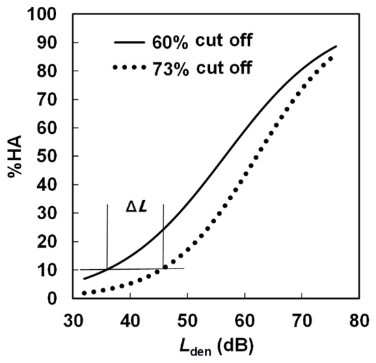 Since the development of the standardized annoyance scales by the ICBEN, they have been used in most socio-acoustic surveys. However, either a 73% cutoff HA (top three categories of the 11-point numerical scale) or a 60% cutoff HA (top two categories of the 5-point verbal scale) has usually been reported in publications. An exception is the study by Wothge et al. [7], who reported the combined effects of aircraft and road traffic noise and of aircraft and railway noise in the Noise-Related Annoyance, Cognition, and Health (NORAH) study. They used only the 5-point verbal scale and demonstrated the relationships between day–evening–night-weighted sound pressure level (Lden) and %HAs for both 60% and 72% cutoffs in their article. The calculation of the 72% cut-off-point was performed according to the method of Miedema and Vos [2]. They investigated differences in Lden between exposure–response curves for 60% and 72% cutoffs at 10% HA and found that the differences were quite large (8–14 dB). This difference is not negligible, considering that Lden values in the exposure–response curves at 10% HA were adopted in the World Health Organization (WHO) Environmental Noise Guidelines in 2018 [8].