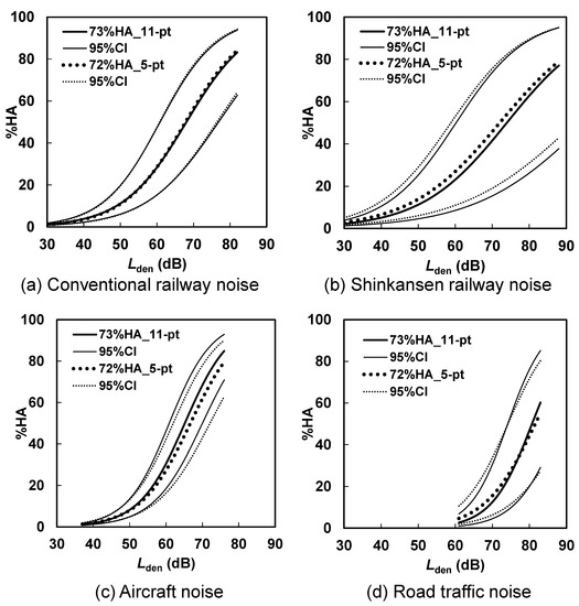 Brink et al. [10] indicated a difference between exposure–response curves for 73% HA obtained using the 11-point numerical scale and for 72% HA using the 5-point scale, particularly in the range from 62.5 dB to 70 dB. To investigate the difference in the present datasets in detail, multiple logistic regression analysis was applied to conventional railway, shinkansen railway, aircraft, and road traffic noise survey data separately. Though significant differences were found in exposure–response relationships between 73% HA using the 11-point numerical scale and 72% HA using the 5-point scale in the Shinkansen and aircraft noise surveys, the effect size was small, and the direction was opposite. Therefore, we might consider that there is practically no systematic difference in exposure–response relationships between 72% HA using the 5-point verbal scale and 73% HA using the 11-point numerical scale. As suggested by the results in Table 10 and Table 11, one of the reasons for the difference in the results was the difference in the correspondence between the 5-point verbal and the 11-point numerical scales among the Japanese, Vietnamese, and Swiss surveys. As shown in Table 10, the HA range (22%) in the Swiss survey was narrower than in Japanese and Vietnamese (29–39%) survey, and in Table 11, the HA range (33%) in the Swiss survey was wider than in Japanese and Vietnamese surveys (23–28%). The relatively wider range of HA when using the 11-point numerical scale may be because the Lden–%HA relationship in the 11-point numerical scale was higher than that in the 5-point scale in the Swiss survey. Nonetheless, the difference in exposure–response relationships between 60% HA and 72% or 73% HA is important.