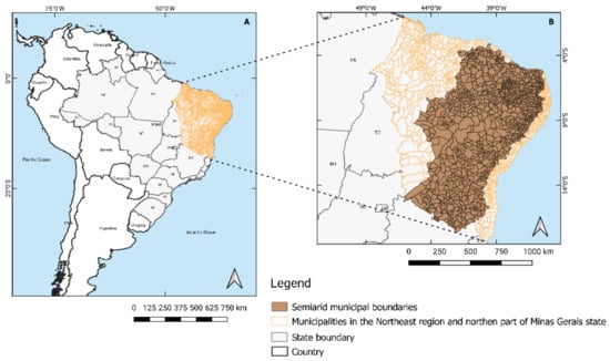 Limits of the study region—Brazilian Northeast region and part of Minas Gerais state (A), and the Semiarid municipalities (B). The 1135 municipalities studied are located mainly in the Northeast region of the country, but also occupy part of the northern portion of the state of Minas Gerais, in the Southeast region (85 municipalities). Adapted from: [].