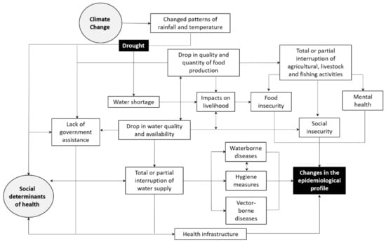 Considering these key concepts, an explanatory model was developed for the Brazilian Semiarid region. Figure 2 represents the possible and complex interactions that are established between sociodemographic, environmental, and health aspects in the context of droughts. It is noticed that the health effects occur slowly and mostly indirectly so that the vulnerability of the population is shaped by factors such as location in the geographical space, the subsistence economy, and the lack of government investment in mitigation and assistance measures that may impact health [,]. In general, changes in rainfall and temperature affect the quantity and the quality of the water available for consumption, producing a cascading scenario of food and social insecurity, damage to health infrastructure or human resources, and other health issues that can modulate the epidemiological profile of the population. The direct and indirect impacts arising from drought influence other determinants of health (e.g., socio-economic vulnerability), as well as being influenced by them, resulting in changes in the population’s health status.