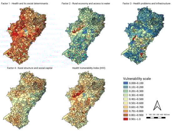 A general pattern of poor values grouped on the frontiers for health and its social determinants index (Factor 1), while the other factors modulated the final vulnerability (HVI) by presenting lower vulnerability scores was observed. An overlap between the areas of greatest vulnerability in each factor was evident, except for Factor 3. Consistently, a group of municipalities in the western portion of the Semiarid was amongst the largest categories of vulnerability of health and its determinants, rural economy, and rural structure, stressing the need for investments in adapting to droughts regarding the socio-economic and water access levels. These localities comprised small towns, with a high dependence on external revenues (i.e., those coming from other sources such as the state and union), with low income from work, high rates of infant mortality and with medium to high levels of previous droughts records [,].