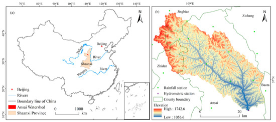 The study area: (a) The geographical location of the Ansai Watershed; (b) The elevation, rainfall and hydrometric stations distribution in the Ansai Watershed.