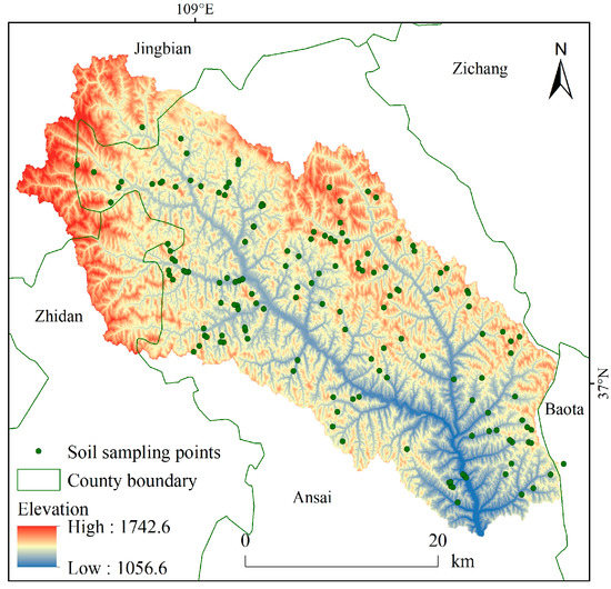 We used 25 m resolution DEM data, obtained from the 1:50,000 database of the National Center for Basic Geographic Information of China [27]. Vector land cover data in 2000 and 2015 was obtained from the Data Center for Resources and Environmental Sciences at the Chinese Academy of Sciences [28]. Daily rainfall data at 20 rainfall stations in and around the Ansai Watershed from 2000 to 2015 was collected from the Hydrological Yearbook of the People’s Republic of China [29]. Remote sensing images from 2000 to 2015 were obtained from the Geospatial Data Cloud [30]. Terrace and silting dam data from 2000 to 2015 were collected from the Statistical Yearbook of Ansai County. Soil data, derived from a dataset of 151 sample points was obtained from a soil survey in the Ansai Watershed conducted in July to August of 2014. In Figure 2, 151 soil sample points are evenly distributed in the Ansai watershed, which can well represent the soil attribute conditions in the study area; the location of sample points is accurately located by handheld GPS.