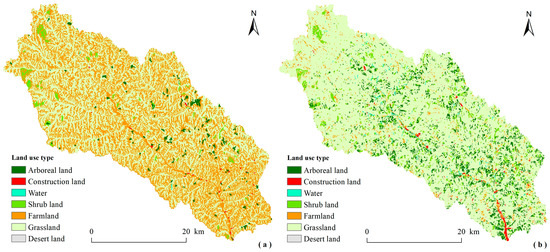 Large-scale vegetation restoration led to significant land use changes in the Ansai Watershed (Figure 3). Land use was dominated by grassland and farmland, while arboreal land and shrub land were scattered and did not form contiguous patterns in 2000. With the progress of vegetation restoration, grassland became the main land use type, and arboreal land and shrub land increased significantly and formed a distribution pattern which decreased gradually from southeast to northwest in 2015. Thanks to the relatively superior natural conditions and the location conditions closer to the urban area, compared with the upstream areas, the implementation of the “GGP” is more active and the benefits of vegetation restoration is more obvious in the downstream areas.
