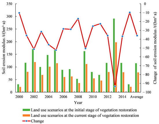The average soil erosion modulus from 2000 to 2015 under the initial and the current scenarios of vegetation restoration was 114.44 t/(hm2·a) and 78.42 t/(hm2·a), respectively, with an average annual reduction of 4.81 × 106 t of soil erosion amount. The soil erosion condition was improved by vegetation restoration, and the soil erosion modulus decreased annually by 10.30, 35.78, 51.37, 31.51, 46.14, 52.40, 28.39, 28.87, 16.87, 50.62, 25.31, 22.61, 35.96, 93.51, 36.83, and 9.75 t/hm2 from 2000 to 2015, respectively (Figure 4). In addition, the effects of vegetation restoration on soil erosion were different in different years, mainly because of the large differences of rainfall in each year. The water and soil conservation benefits of vegetation restoration was more obvious in the years with heavy rainfall such as 2002, 2005, 2009, and 2013.