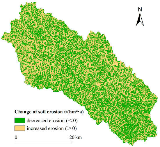 The average soil erosion modulus changes from 2000 to 2015 were divided into two categories, increased erosion (>0) and decreased erosion (<0), based on the reclassification function of ArcGIS 10.6 (Figure 5). During the study period, the areas with increased erosion and decreased erosion were alternately distributed in the Ansai Watershed. The south and southeast of the Ansai Watershed had obvious improvement effects on soil erosion and were the main areas with decreased soil erosion, while the northwest of the study area was the main region experiencing increased soil erosion. Although the areas with increased and decreased soil erosion distributed alternatively, the former was lower than the latter (Table 6). The area of decreased and increased soil erosion from 2000 to 2015 was 696.92 km2 and 637.12 km2, respectively, accounting for 52% and 48% of the total land area of the Ansai Watershed.