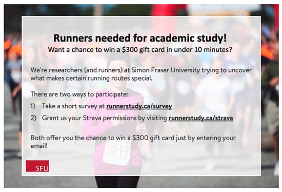 The study population consisted of a sample of people who self-identify as runners. No constraints were established concerning the gender, ethnicity, country of residence, or ability of the respondent; however, for ethics purposes, we limited the survey to only those aged 19 years and older. Both convenience and snowball sampling were used to recruit potential respondents from this population. Recruitment primarily took place through advertisements placed in North American running magazines and websites such as Runner’s World, Canadian Running, Ultrarunning Magazine, Trail Runner Magazine, and irunfar.com, as well as targeted social media ads on Facebook and Instagram. We also conducted in-person recruitment through local run clubs and running apparel stores using post-card advertisements (Figure 1). In several cases, we reached out by email to clubs and stores further afield. The survey was incentivized with the promise of a chance to win one of three CDN 300 gift cards from a running store.