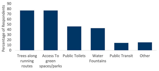 In terms of features of the environment that runners find conducive to running, no significant difference was found between genders to the closed-ended responses. Trees along running routes and access to green space were both top answers for men and women, echoing other studies which have found that running in parks or on mostly green routes was significantly associated with the perceived attractiveness of the running environment [16,18].