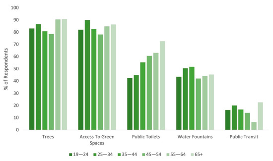 Large and near-equivalent percentages of respondents found access to green spaces (77.1%) and tree-lined running routes (70.0%) to be the most conducive for running (Figure 2). Public toilets and water fountains were also highly valued by close to half of all respondents. For public toilets in particular, there was an increasing preference by age group, from 42.6% for those aged 19–24 to 72.7% for those aged 65+ (Figure 3). A total of 188 respondents provided their own answers. These results were analyzed thematically; twelve themes were identified. In order of most common to least common, they were: continuity of running path, quiet (away from traffic and people), street/path lighting, access to green/blue space, maintained paths, clearly defined pedestrian routes/safety features (e.g., crosswalks, separated pedestrian/cyclist paths), aesthetically pleasing, access to amenities, terrain specifics (e.g., hilly routes, flat routes, mix of both), wide running paths, clear sightlines and other people around for safety, and running path is nearby.