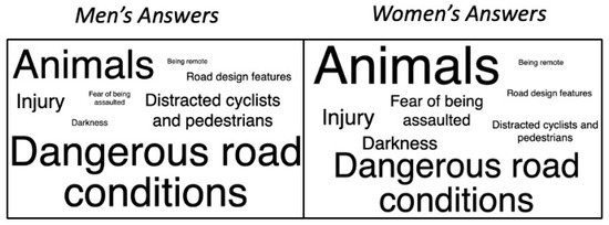 When examined by gender, men’s and women’s written answers showed several differences. Both animals and the fear of being assaulted are greater concerns for women than they are for men. On the other hand, men showed greater concern over distracted cyclists and pedestrians, as well as dangerous road conditions. Figure 6 demonstrates the frequency of each theme by gender.