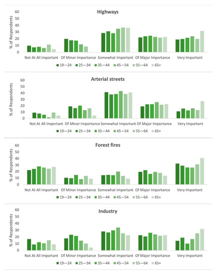 Lastly, for the survey question regarding the importance of avoiding pollution from various sources, the largest number of respondents found it somewhat important to avoid pollution from highways, arterial streets, and industry. Results of chi-square tests for each of the pollution sources listed showed no significant association with gender. Broken down by age, however, we see that a greater percentage of those over 65 found it “very important” to avoid each listed source of pollution than any other age group (Figure 7). Open-ended responses were classified by content according to the pollution source referenced. They include burning garbage (2 respondents), dust (1 respondent), food processing plants (1 respondent), food truck generators (1 respondent), forest fires (1 respondent), garbage (smell and litter) (3 respondents), noise pollution (2 respondents), pesticides and agricultural pollution (3 respondents), second-hand smoke (1 respondent), and sewage (4 respondents). Eighteen responses did not address the question being asked and were therefore excluded from this classification.