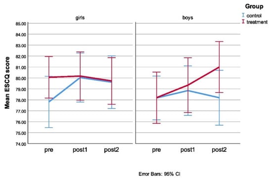 | Emotional Skills and Competence Questionnaire (ESCQ-C) | p < 0.05 at 1st time-point; p > 0.05 at all 2nd and 3rd time points | χ2(2) = 9.322, p = 0.009 | F(1.985, 1103.556) = 3.787, p = 0.023, partial η2 = 0.007, ε = 0.992 | Two-way interaction (gender × group): 1st time-point F(1, 559) = 1.039, p = 0.309 2nd time-point F(1, 558) = 0.024, p = 0.877 3rd time-point F(1, 561) = 1.287, p = 0.257 |