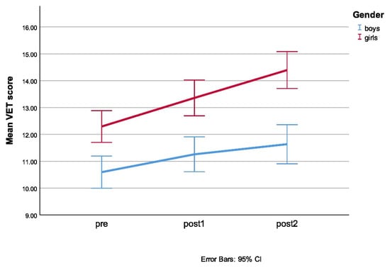 | Vocabulary of Emotions Test (VET) | p > 0.05 at all three time points | χ2(2) = 14.252, p = 0.001 | F(1.968, 1104.140) = 0.150, p = 0.858, partial η2 = 0.000, ε = 0.984 | Two-way interaction (time × gender): F(1.968, 1104.140) = 4.605, p = 0.011; Simple main effect of gender at all three time points of testing: F(1, 561) = 15,646, p = 0.000; F(1, 561) = 19.539, p = 0.000; F(1, 561) = 29.328, p = 0.000 The effects of maturation: F(2, 1695) = 11.134, p < 0.05, partial η2 = 0.013 Gender differences: F(1, 561) = 28.42, p < 0.01, partial η2 = 0.048 |