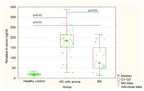 Our results also indicate that the increase in renalase synthesis in hemodialysis patients with chronic kidney disease is mainly expressed in the serum. Moreover, the increase in serum renalase concentrations in hemodialysis patients with chronic kidney disease is greater than that in hemodialysis patients after bilateral nephrectomy. Chronic kidney disease is characterized by a number of metabolic changes and changes in the circulatory system that may increase serum renalase levels more strongly than bilateral nephrectomy.