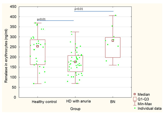 Additionally, we compared renalase concentrations between patients after bilateral nephrectomy and chronic kidney disease hemodialysis patients with anuria. Serum renalase concentrations in patients after bilateral nephrectomy were significantly lower in comparison with those in hemodialysis patients with anuria (101.1 ± 65.5 vs. 177.2 ± 68.3, p < 0.01) (Table 1, Figure 1). In contrast, renalase concentrations in erythrocytes were significantly higher in patients after bilateral nephrectomy in comparison with those in hemodialysis patients with anuria (275.8 ± 76.7 vs. 176.4 ± 59.1, p < 0.01). Similarly, renalase concentrations calculated per gram of hemoglobin (renalase ng/g Hb) were significantly higher in patients after bilateral nephrectomy in comparison with those in hemodialysis patients with anuria (994.9 ± 345.5 vs. 573.1 ± 205.8, p < 0.01 (Table 1, Figure 2 and Figure 3).
