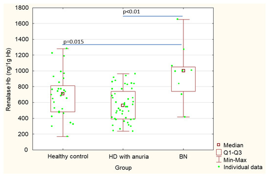 The same hemolysates (diluted 1:3 in the first step) were used directly in the immunoenzymatic assays according to the manufacturer’s instructions. If the hemolysates were too concentrated (more than 5 g/dL of hemoglobin in the lysate), the samples were further diluted with ultrapure water to obtain hemoglobin concentrations in the range of 4–5 g/dL. The total concentration of renalase in the erythrocytes (expressed in ng/mL), as well as the concentration of renalase expressed per gram of Hb (ng/g Hb), are presented. Renalase concentration was expressed per gram of Hb to account for variability in the patients’ erythrocyte and hemoglobin values.