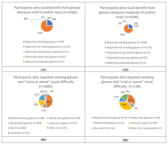 Comparing reported versus clinical impairment assessment unmet/undermet need for near and/or distance glasses (mild vs. moderate vision impairment (VI)). (A1): Participants who could benefit from glasses (distance mild VI and/or near) (n = 4166), (A2): Participants who could benefit from glasses (distance moderate VI and/or near) (n = 4246), (B1): Participants who reported needing glasses and “some or worse” visual difficulty (n = 1681), (B2): Participants who reported needing glasses and “a lot or worse” visual worse difficulty (n = 128).