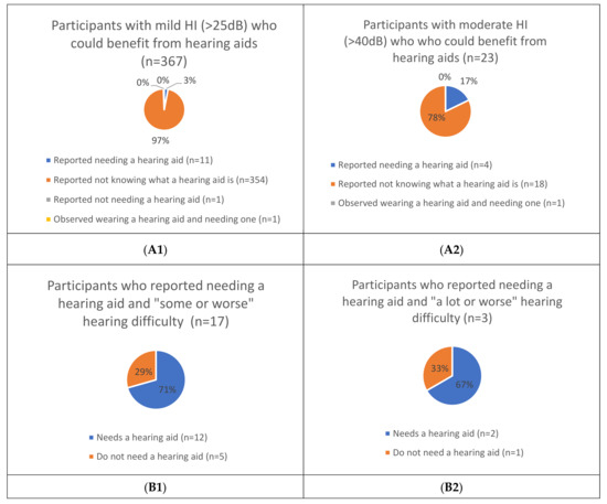 Of the 367 people with mild/worse HI (>25 dB) who were clinically assessed to likely need hearing aids, 11 (3%) reported needing one, 354 (97%) reported not knowing what it was and <1% (2 participants) were either observed to be wearing one (n = 1) or reported not needing one (n = 1) (see Figure 2(A1)). Of the 23 people with moderate/worse HI (>40 dB) who were clinically assessed to likely need hearing aids, 4 (17%) reported needing one, 18 (78%) reported not knowing what it was, and 1 (<1%) was observed to be wearing one (see Figure 2(A2)).