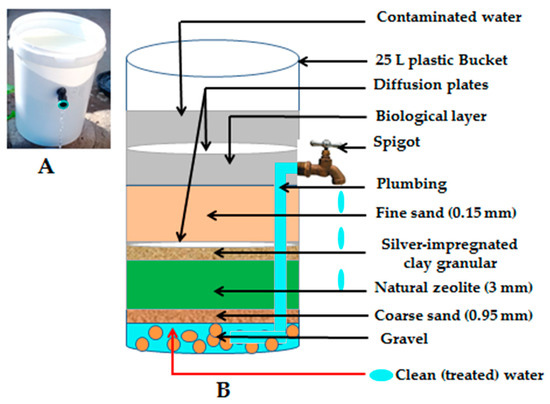 (A) Biosand filter with zeolite-silver (BSZ-SICG); (B) Schematic representation of the BSZ-SICG. As published by [20].