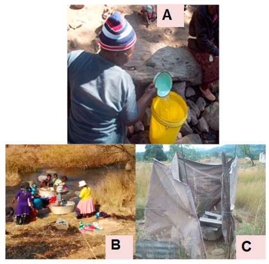 Community member of Makwane collecting water from one of the unprotected sources (A); community members doing their laundry in one of the rivers (B) where they also collect water for domestic purposes; and (C) one of the unsafe pit latrines of Makwane Village.