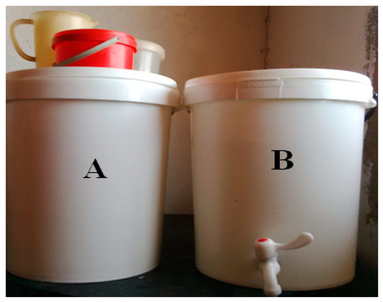 For the purposes of the study, a structured questionnaire was designed and used to collect information such as number of children under 5 years of age per household, number of individuals living in the household, water sources and storage conditions of the water, sanitation facilities, and hygiene practices. In this study, hygiene practices refer to hand hygiene practices (washing of hands with soap and water after toilet use). Moreover, all selected households were supplied with 2 × 25 L plastic buckets for the storage of treated water. One of the buckets had a spigot installed 5 cm from the bottom (improved storage container) and it was used as intervention of the study, while the other one that did not have a tap installed (regular storage container) was used as the control. Figure 4 shows types of storage containers supplied to the householders.