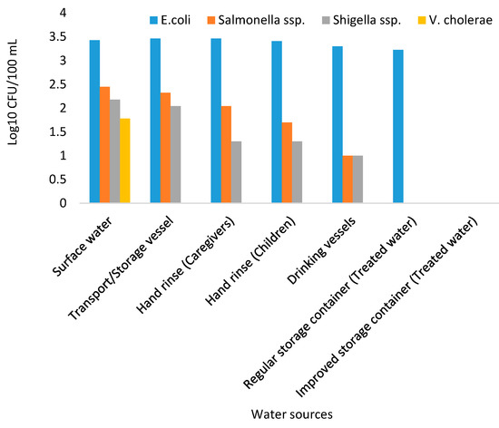 During the study period, a total of 960 water samples collected from surface water sources, storage containers, drinking vessels, regular storage containers, improved storage containers, and hand-rinse water of caregivers and children under the age of 5 years were analysed using culture-based methods for the presence of presumptive enteropathogenic bacteria. The mean concentrations of presumptive enteropathogenic bacteria are presented in Figure 5. Of all the enteropathogenic bacteria isolated, E. coli was found to have higher counts followed by Salmonella, Shigella, and V. cholerae, respectively. Moreover, none of the enteropathogenic bacteria were detected in treated water stored in improved containers. Of all the enteropathogenic bacteria enumerated, E. coli was found to be more prevalent with the counts ranging from 3.462 Log10 CFU/100 mL to 3.225 Log10 CFU/100 mL, followed by Salmonella spp. and Shigella spp. with counts ranging from 2.447 Log10 CFU/100 mL to 1 Log10 CFU/100 mL and 2.176 Log10 CFU/100 mL to 1 Log10 CFU/100 mL, respectively. Vibrio spp. was the least detected, with their counts ranging from 0 to 1.778 Log10 CFU/100 mL and it was only detected in surface water samples.