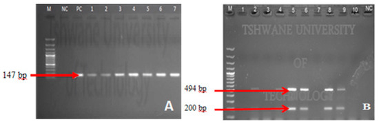 The DNA from the archived samples was extracted with the ZR Fungal/Bacterial DNA MiniPrep™ test kit (ZYMO Research, Pretoria, South Africa) according to the manufacturer’s procedures. The samples were first purified three times by sub-culturing on nutrient agar followed by incubation at 37 °C overnight.