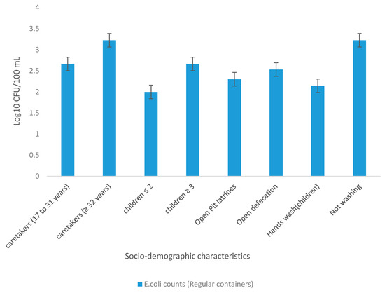 Not only does the age and number of children contribute to microbial deterioration of drinking water, but also the age of elders/caregivers contributes to deterioration of water quality at POU [32]. In this study, the link between age of caregivers and water quality was investigated. It was observed that the age of household members was associated with the quality of stored drinking water in regular containers. Households with caregivers aged 32 years and above were found to have higher E. coli counts (3.23 Log10 CFU/100 mL) as opposed to households with caregivers aged between 17 and 31 years (2.66 Log10 CFU/100 mL). Sanitation and hygiene practices are likely to have made contributions to microbial drinking water quality at POU in this study (Figure 7). It was demonstrated that households which practised open defecation had the highest levels of E. coli (2.531 Log10 CFU/100 mL) in drinking water at the point-of-use, while households with pit latrines had lower E. coli counts (2.301 Log10 CFU/100 mL), but the difference was not significant. Lack of proper hygiene practices, such as drawing water by dipping utensils into storage vessels and not washing hands after using the toilet, has been shown to contribute to the deterioration of microbial quality of drinking water [34,35].