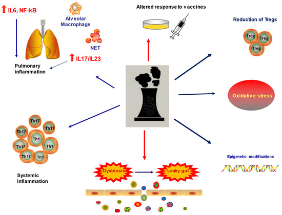 Oxidative stress in the airways also increases after exposure to air pollution, activating NF-kB and stimulating the production of Th1 lymphocytes. Also, alveolar macrophages and airway epithelial cells start expressing pro-inflammatory cytokines, stimulating dendritic cells to migrate toward local lymph nodes, causing cell necrosis and apoptosis. Neutrophil extracellular traps (NETs) are released, and IL-17 and IL-23 levels increase. All these reactions induce an inflamed niche [55].