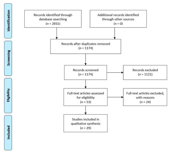 The search strategy resulted in a total of 2931 articles identified from the four databases. After de-duplication, a total of 1174 unique articles remained. After screening of title and abstract, a total of 53 studies remained. From these 53 studies, 29 studies were included in this review after a full-text screening. Table A2 includes a list of excluded articles during full-text screening. Figure 1 presents a flowchart of the search procedure.