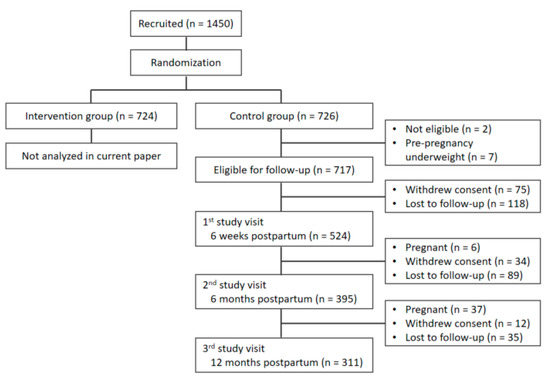 Details on the sample size calculation of the INTER-ACT study are described in the study protocol [28]. In the larger RCT, 1450 participants were recruited, of which 724 were randomized into the intervention group and 726 into the control group. Randomization was performed by the electronic Case Report Form (eCRF) system. Blinding could not be applied due to the nature of the RCT. For the current analyses, only the control group participants were selected. They received usual care only. Two participants were removed because they did not meet eligibility criteria. Seven participants had an underweight pre-pregnancy BMI and were excluded from the analyses. This resulted in 717 participants who were eligible for the current analyses. The first study visit (six weeks postpartum) was completed by 524 control group participants; 386 completed the second study visit (six months postpartum); 311 completed the third study visit (12 months postpartum) (Figure 1).