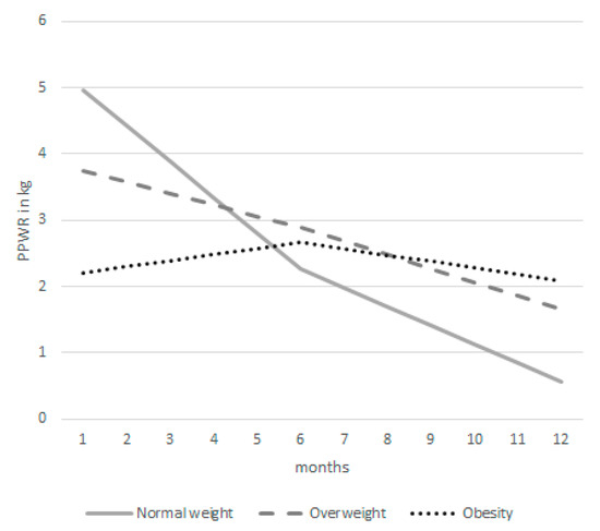 The estimated evolution of postpartum weight retention among women with normal weight, overweight and obesity based on the multivariate mixed model (N = 524 at 6 weeks, N = 395 at 6 months, N = 311 at 12 months postpartum).