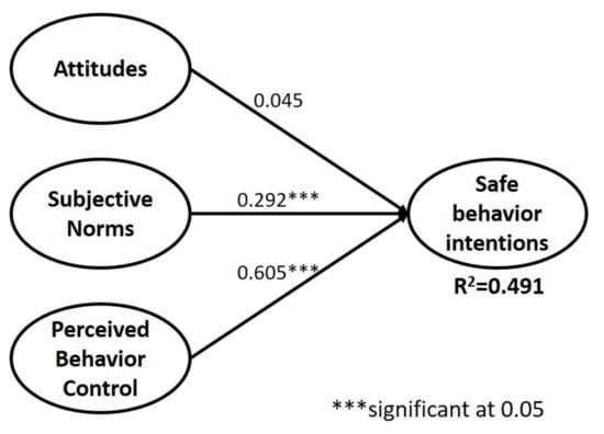 According to the PLS analysis results, this research used bootstrapping as the resampling method, with 5000 resamples used to assess the PLS results (Figure 2) []. According to the analysis results, the overall research model explained 49.1% of the variance in safe behavior intentions; thus, the current model has favorable explanatory power. For the empirical results testing H1, H2, and H3, these supported only H2 and H3. For the hypotheses related to the TPB, both subjective norms (H2) and perceived behavioral control (H3) significantly affected safe behavior intentions. Moreover, the path coefficient of perceived behavioral control reached 0.605. However, attitude (H1, β = 0.045) did not have a significant influence on safe behavior intentions.
