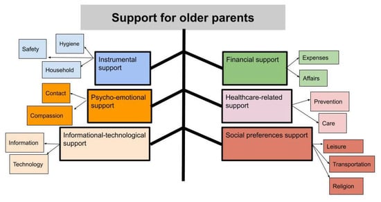 The third most important category of FS for older parents was psych-emotional support. It meant that older people from both genders were interested in family parties, frequent visits by children, and daily greeting contact. Emotional support for older people consists of affective interactions between older people and their significant others, which comprise the most valuable type of support from other people’s perspectives [12]. Emotional support by family members improves psychological wellbeing [11] and happiness [53] among older people. Nonetheless, some family members, particularly adult children, may greatly focus on instrumental and financial support for their older parents at the expense of emotional support [54]. Therefore, they should be provided with education about the importance of emotional support for older parents in order to improve their sense of satisfaction and wellbeing.