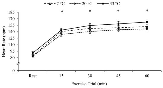 Resting core temperature during the initial 5 min of exposure in the cold (7 °C) was greater than room temperature (20 °C; p = 0.030) and hot (33 °C; p = 0.007). Core temperature remained higher in 7 °C than 20 °C (p = 0.048) and 33 °C (p = 0.022) through the first 15 min interval; however, groups were similar at 30 (p > 0.05) and 45 min (p > 0.05). The 33 °C group had a higher core temperature than the 20 °C (p = 0.016) and the 7 °C (p = 0.044) groups at 60 min. Core temperature data are presented in Figure 2.
