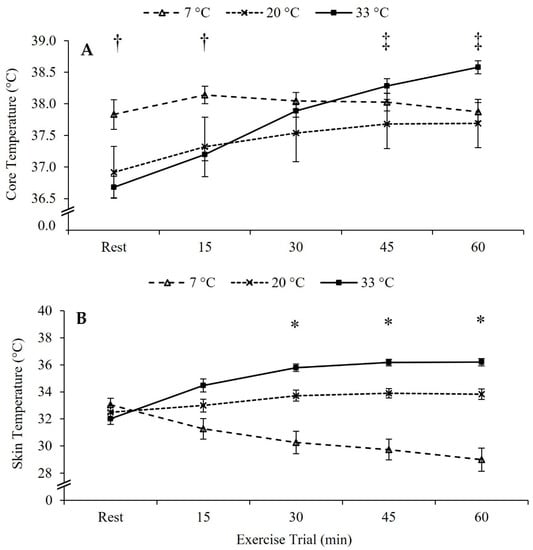Temperature Data. (A) Core temperature during the exercise trial. (B) Skin temperature during the exercise trial. Data are reported in mean ± SE. * p < 0.05, all groups different. † p < 0.05, 7 °C different from other temperatures. ‡ p < 0.05, 33 °C different from other temperatures.