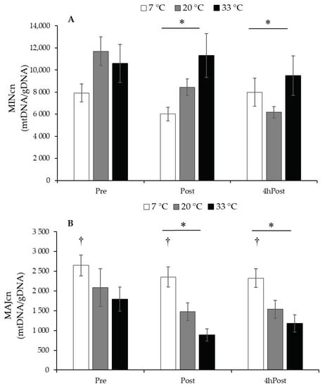 Regional mtDNA copy number. (A) mtDNA Minor Arc copy number (MINcn) data relative to reference gene B2M. (B) mtDNA Major Arc copy number (MAJcn) data relative to reference gene B2M. Data are reported in mean ± SE. * p < 0.05, less than Pre, main effect over time. † p < 0.001, greater than 20 °C and 33 °C, main effect for temperature.