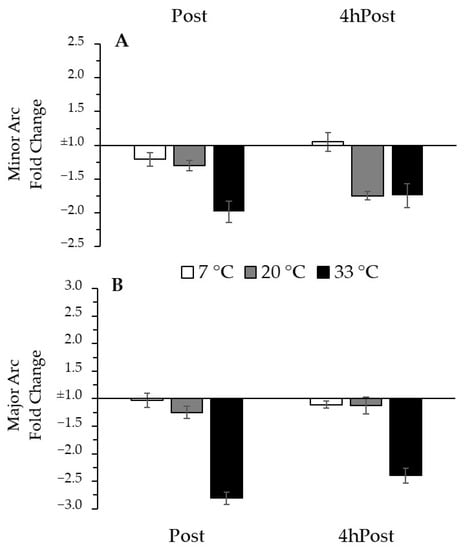 To adjust for group differences in baseline mtDNA and to focus on the changes that occurred with the intervention, we normalized our data relative to the Pre time-point. Relative to Pre, there was no change in MINcn due to exercise (p = 0.518), nor was it influenced by temperature (p = 0.114). Relative to Pre, there was no change in MAJcn due to exercise (p = 0.149), but there was a trend for an effect of temperature (p = 0.056). The trend for a temperature effect would indicate a greater relative decrease with exercise in the 33 °C group compared to the 7 °C group (p = 0.019) but no difference compared to the 20 °C group (p = 0.467). Thus, after normalization for the initial copy number values, a trend emerged suggesting greater exercise-induced reduction in MAJcn after exercise in the heat. The negative inverse fold change data from Pre for MINcn and MAJcn are presented in Figure 4.