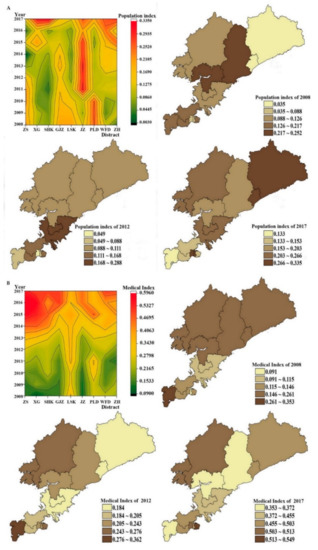Compared with the population development index, the overall development index in medical services among urban and rural areas showed a steady upward trend (Figure 2B). After 2014, the development index of medical services in urban areas increased significantly, with the highest values found in Zhongshan (0.594) and Xigang Districts (0.579) in 2016. Compared with urban areas, the improvements in the development index of medical services among rural areas were not significant. Jinzhou was the only district to achieve a stable growth trend. By comparing the regional medical service development index (Figure 2B) in 2008 and 2017, we found that both urban and rural areas had positive growth in the medical service development index. The medical service development index in urban areas increased by more than 200%, with Xigang District (0.091~0.495, 446.72%) experiencing the largest increase at 446.72% (0.091–0.495). Among rural areas, the largest increase was in Jinzhou District (0.115–0.455, 294.30%)