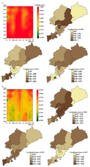 In 2008–2017, there was a noticeable coupling run-in stage between urban areas and rural areas (Figure 3A). The coupling degree between population and medical services in urban areas was unstable, and there was a relatively long coupling run-in stage in Zhongshan District (2013–2016) and Shahekou District (2011–2014), and obvious low-level coupling occurred in Zhongshan District (0.171) in 2014. Among rural areas, Lyshunkou District (0.962–1) and Wafangdian City (0.852–0.988) maintained high levels of coupling, while Jinzhou District (2012–2016, 0.684–0.756) experienced a long period of coupling and running-in. Comparing the coupling degree between population and medical services, we found that most areas in Dalian City experienced a decrease in the coupling for 2008–2017. The few areas that experienced positive growth include Shahekou District (2.66%), Wafangdian City (1.34%), and Zhuanghe City (41.39%).